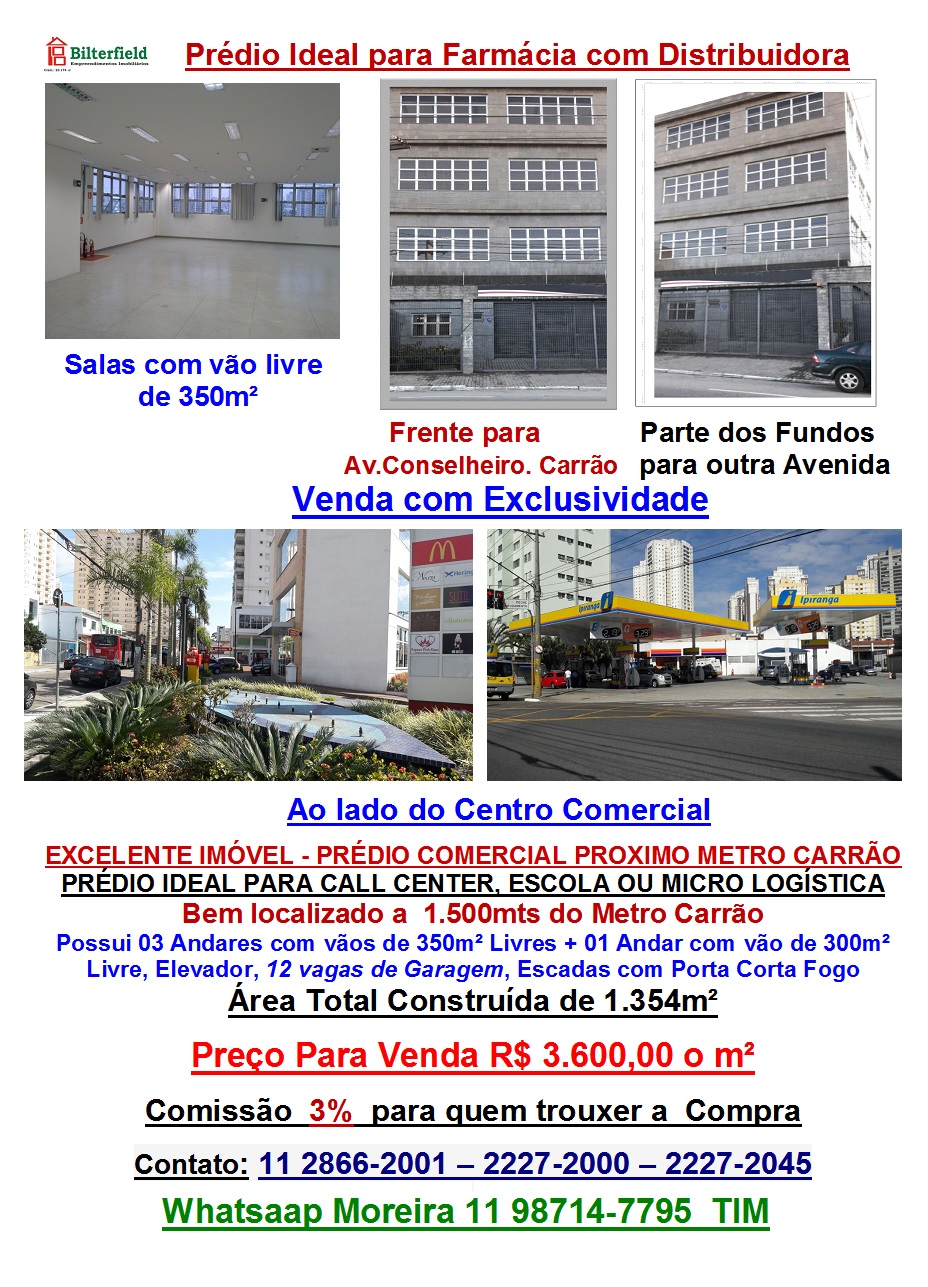 O Prédio possui uma Estrutura Excelente, Bem Construído, com infraestrutura Magnífica, devido a sua localização, próximo do Metro Carrão, a 2.500mts do Shopping e Metro Tatuapé, fácil acesso aos Bairros, Aeroportos e as Rodovias; contem 03 Andares com vãos de 350m² Livres, Possui + 01 Andar com vão de 300m² Livre, Elevador, e 12 vagas de Garagem, possuindo uma área de terreno com 581 m², e Área construída de 1354 m² - tem frente para duas avenidas, prédio vertical com 04 pavimentos , servido por elevador com porta de 1,40m largura x 1,90 m de altura, Fachadas em Granito, Caixilharia em Aluminio com Vidros Bronze Piso em Granilite, escadas em Granito, Bancadas de Lavatórios em Granito, diversos Wc ,Refeitório com Copa e Cozinha.